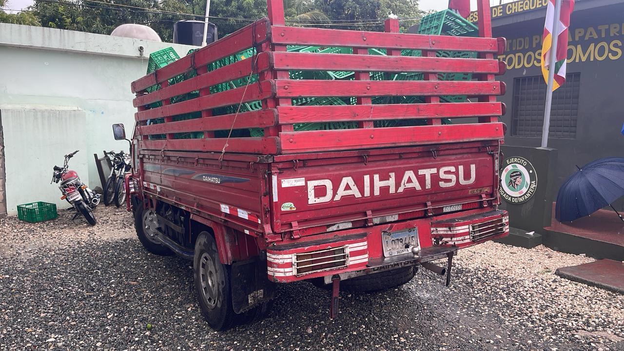 Los militares y agentes, de puesto en el chequeo del kilómetro 15, detuvieron al conductor de un camión, marca Daihatsu, color rojo, placa L-078445, quien traía en la parte trasera, una lona y decenas de huacales vacíos, utilizados para cargar productos agrícolas.