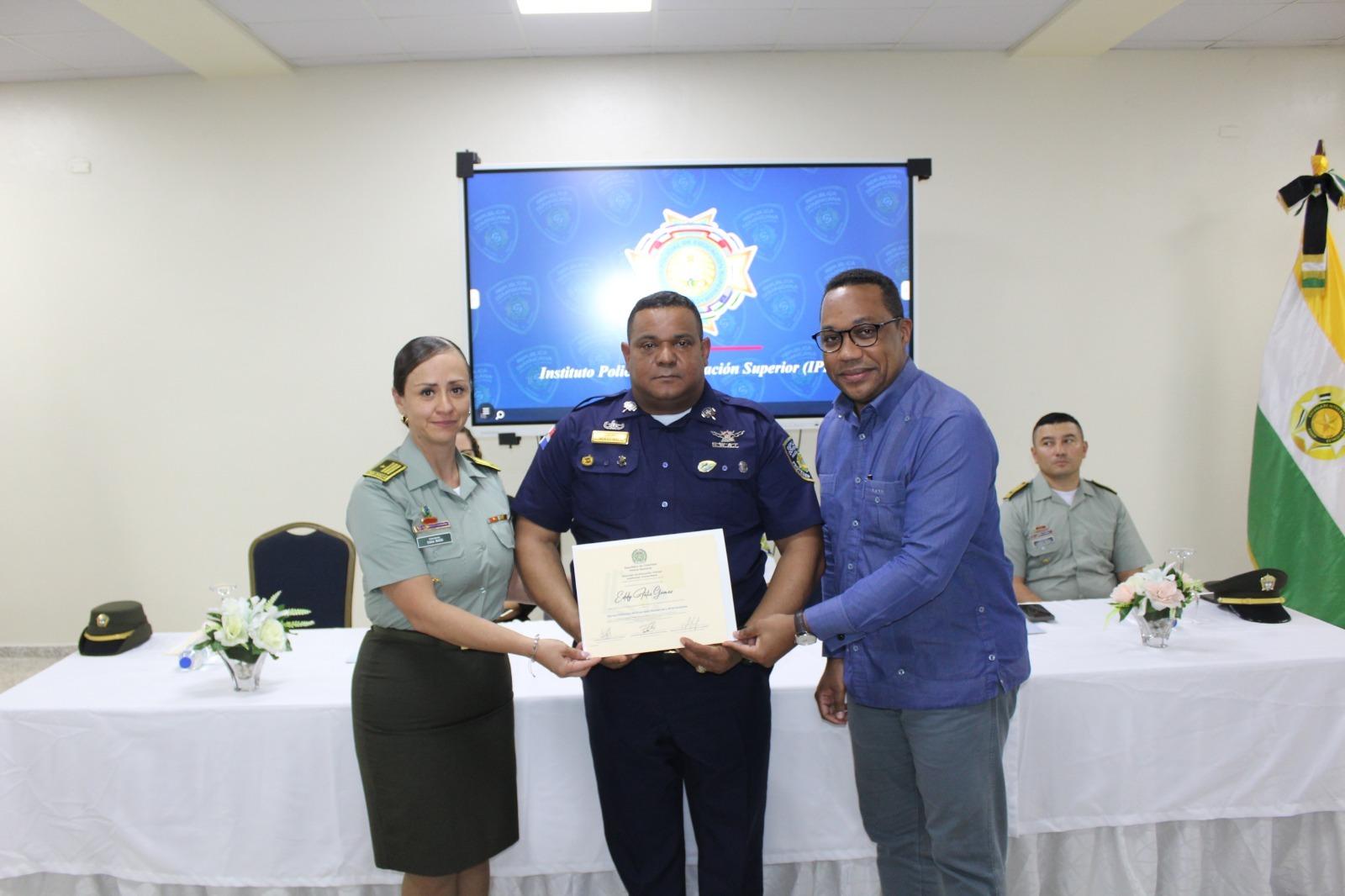 El acto de clausura, realizado en el salón multiuso académico del IPES, fue encabezado por su rector, general Juan Hilario Guzmán Badía; el subdirector del DICRIM, coronel Ysaias Tamarez Santiago, en representación del director central de esa dependencia, general Pedro Matos Pérez; la subdirectora interina de INL en el país y asesora en asuntos policiales, Rosa Ángela Peña en representación de la Embajada de los Estados Unidos de América; el jefe de la Comisión de Instructores de la Policía Nacional de Colombia, intendente Diana María Marín Quiroja; y el subintendente de ese cuerpo policial, Duberney Sánchez Galindo.